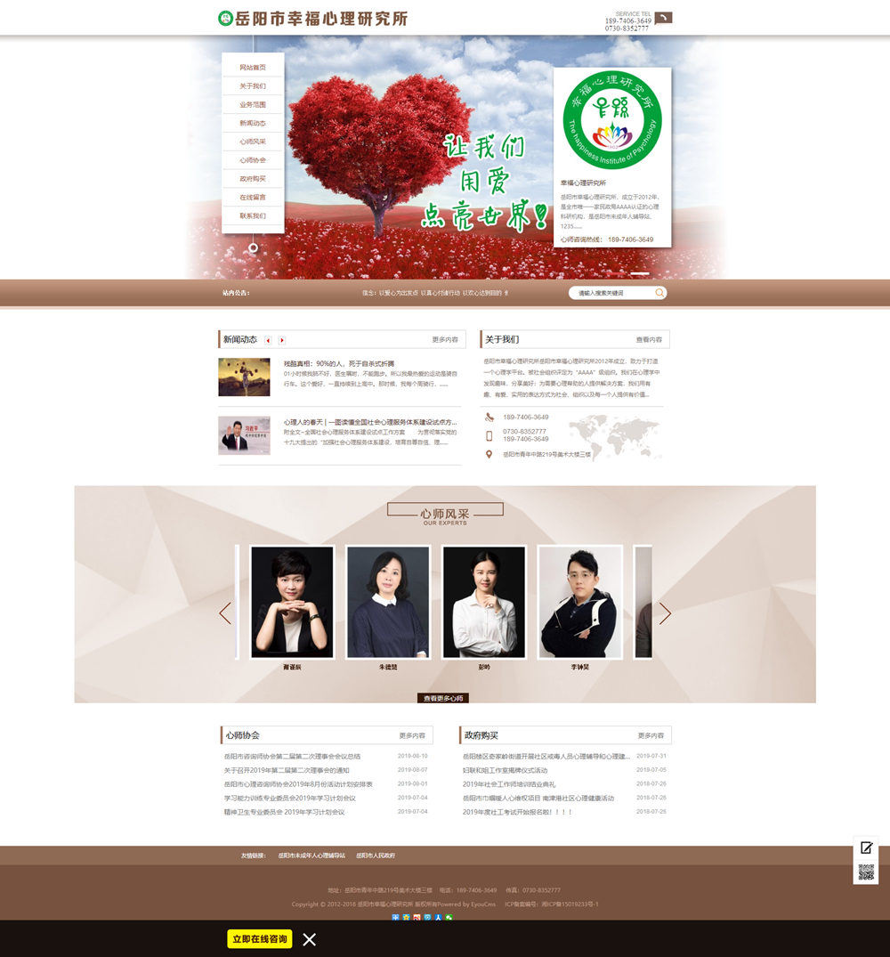 岳阳市幸福心理研究所2012年成立,致力于打造一个心理学平台。被社会组织评定为"AAAA"级组织。我们在心理学中发现趣味,分享美好;为需要心理帮助的人提供解决方案,我们用有趣、有爱、实用的表达方式为社会、组织以及每一个人提供有价值的心理学服务。